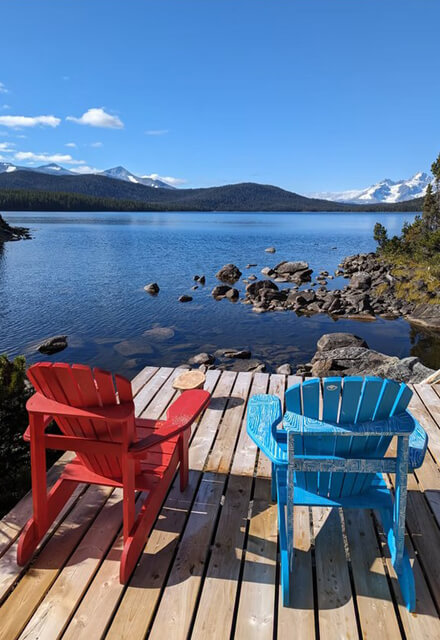 An die Cabin schließt sich eine Terrasse direkt am Wasser an. Von dort kann man auf der „Spirit Bench“ sitzen und den vollen Blick auf das majestätische Bergpanorama genießen.