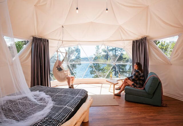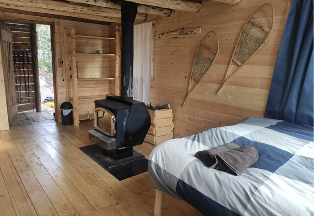 Jede Hütte verfügt über einen holzbeheizten Ofen, bequeme Betten, Sitzbereich und praktischen Stauraum. Fließendes Wasser, Dusche und Komposttoilette sorgen für Komfort, ohne das Naturerlebnis zu beeinträchtigen.